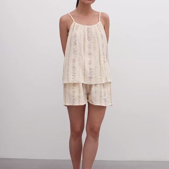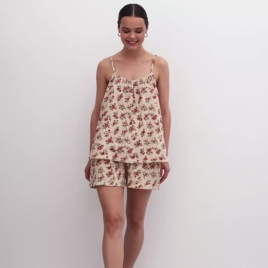 Son tissu respirant et sa coupe fluide offrent un confort absolu, tandis que ses bretelles fines et son imprimé délicat subliment la féminité avec simplicité.