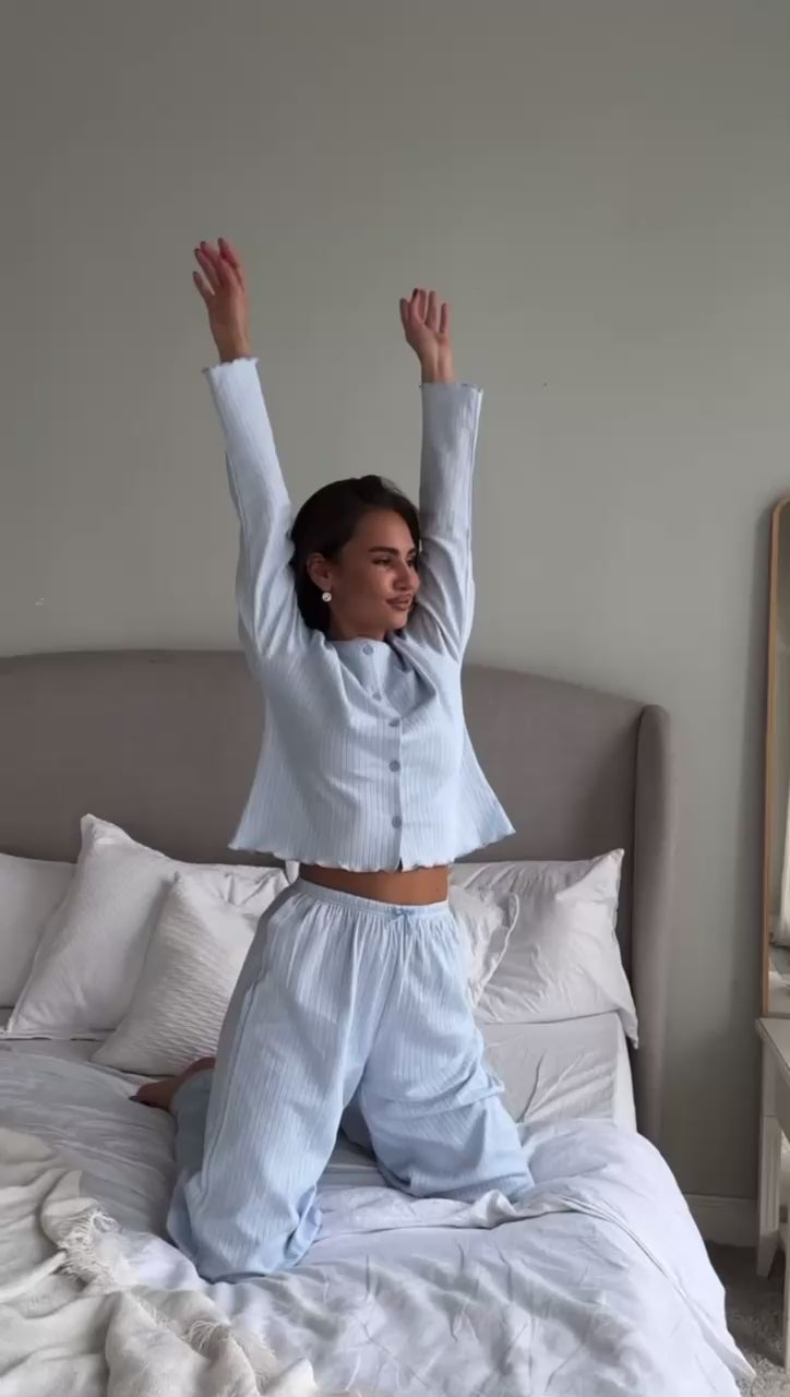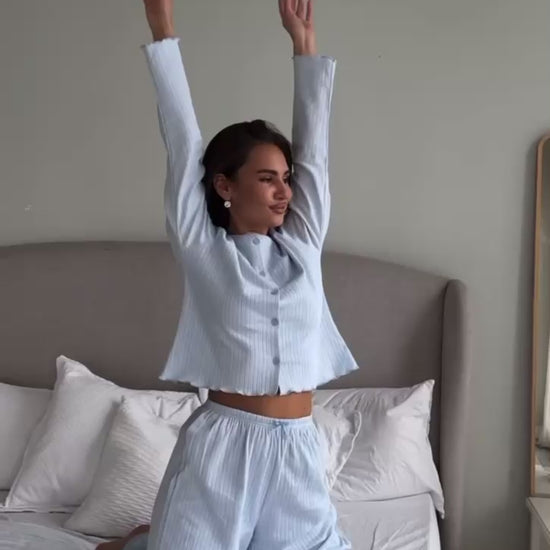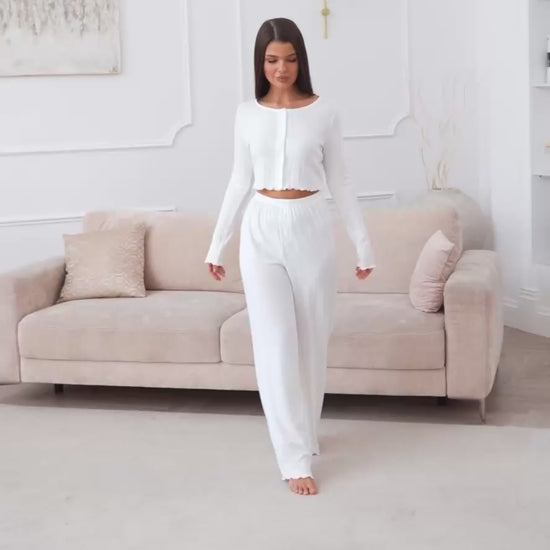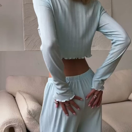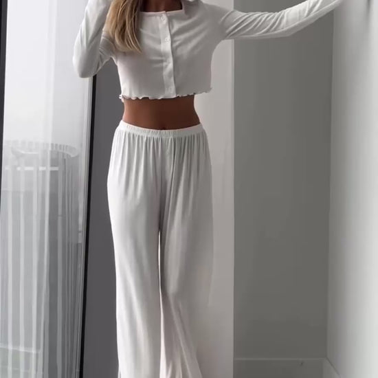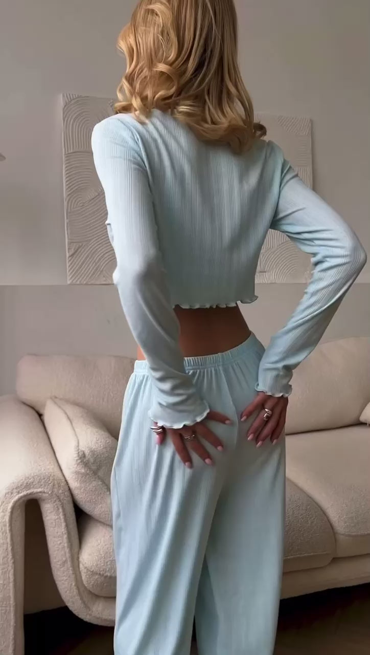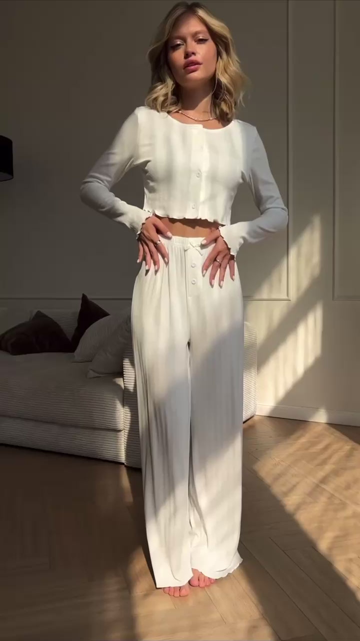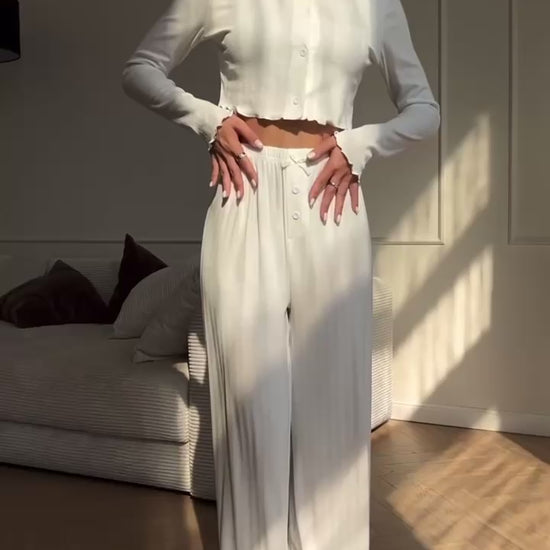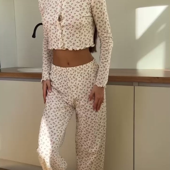 L’ensemble Amourelys associe un cardigan à boutons et un pantalon fluide pour des soirées cocooning chic et confortables.
